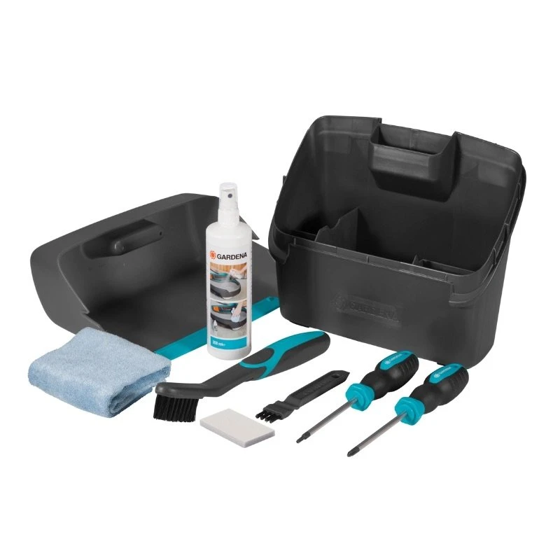 De GARDENA Onderhoudsset voor robotmaaiers bevat een reinigingspad tegen vuil, twee verschillende borstels, een reinigingsspray en een speciale schroevendraaier om bijvoorbeeld zelf de messen te vervangen.