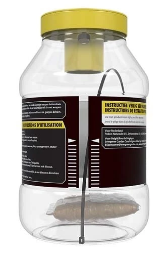 Draai de dop van de val en haal de tiewrap en het flesje eruit. Maak het flesje open en leeg de inhoud in de val. Vul de wespenval tot aan de maatstreep van het etiket met lauw water. Draai de deksel op de val en schud voorzichtig zodat er een homogeen mengsel ontstaat. Trek de bovenkant van de dop omhoog. Plaats de wespenval buiten. Bij voorkeur op een zonnige warme plek, op ongeveer 5 meter afstand van menselijke activiteiten. Gebruik de tiewrap om de val ergens aan te bevestigen