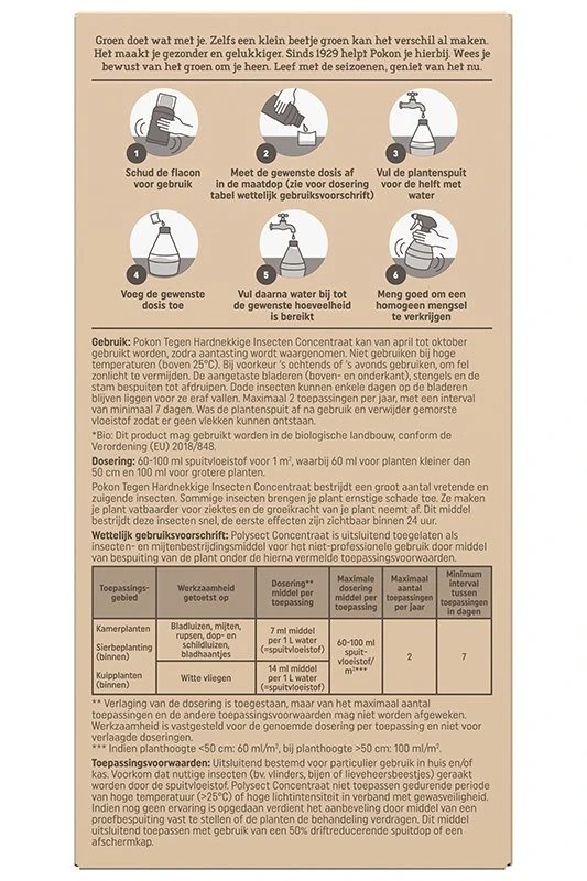 Pokon Bio Tegen Hardnekkige Insecten Polysect Concentraat bestrijdt een groot aantal vretende en zuigende insecten. Sommige insecten brengen je plant ernstige schade toe. Ze maken je plant vatbaarder voor ziektes en de groeikracht van je plant neemt af. Dit middel bestrijdt deze insecten snel, de eerste effecten zijn zichtbaar binnen 24 uur. Pokon Tegen Hardnekkige Insecten Concentraat kan van april tot oktober gebruikt worden, zodra aantasting wordt waargenomen. Niet gebruiken bij hoge temperaturen (boven 25 graden Celsius). Bij voorkeur ’s ochtends of ’s avonds gebruiken, om fel zonlicht te vermijden. De aangetaste bladeren (boven- en onderkant), stengels en de stam bespuiten tot afdruipen. Dode insecten kunnen enkele dagen op de bladeren blijven liggen voor ze eraf vallen. Maximaal 2 toepassingen per jaar, met een interval van minimaal 7 dagen. Was de plantenspuit af na gebruik en verwijder gemorste vloeistof zodat er geen vlekken kunnen ontstaan.