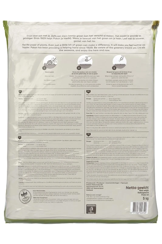 Door je gazon te voeden krijg je een sterk en gezond gazon. De PokonGazonmest met Kalk 3-in-1 is zeer geschikt voor elk gazon, het hele jaar door. Deze hoogwaardige gazonmeststof op basis van organisch minerale grondstoffen bevat een uitgebalanceerde mix van essentiële voedingsstoffen. Uniek is de toegevoegde kalk in de korrel. In plaats van apart kalk en voeding te strooien ben je met deze gecombineerde korrel dus in 1 keer klaar. Met extra magnesium en ijzer waardoor je gazon bovendien een mooie volle groene kleur krijgt. Door het hoge kaliumgehalte wordt je gazon sterker, heb je minder last van mos en krijgt het gras meer weerstand tegen vorst in de winter. Deze gazonmest is ook zeer geschikt als bemesting nadat je graszoden hebt gelegd.